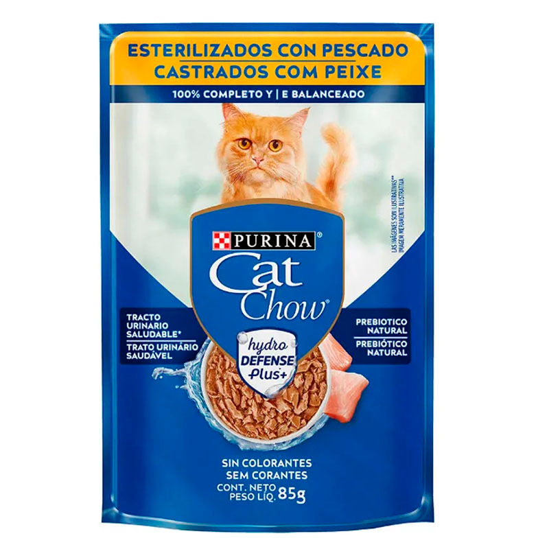 El alimento húmedo Cat Chow Esterilizados con sabor a pescado está formulado especialmente para gatos esterilizados. Su receta ofrece un equilibrio ideal de nutrientes que ayuda a mantener un peso saludable y favorece la salud del sistema urinario, mientras proporciona una comida deliciosa y completa para tu felino.